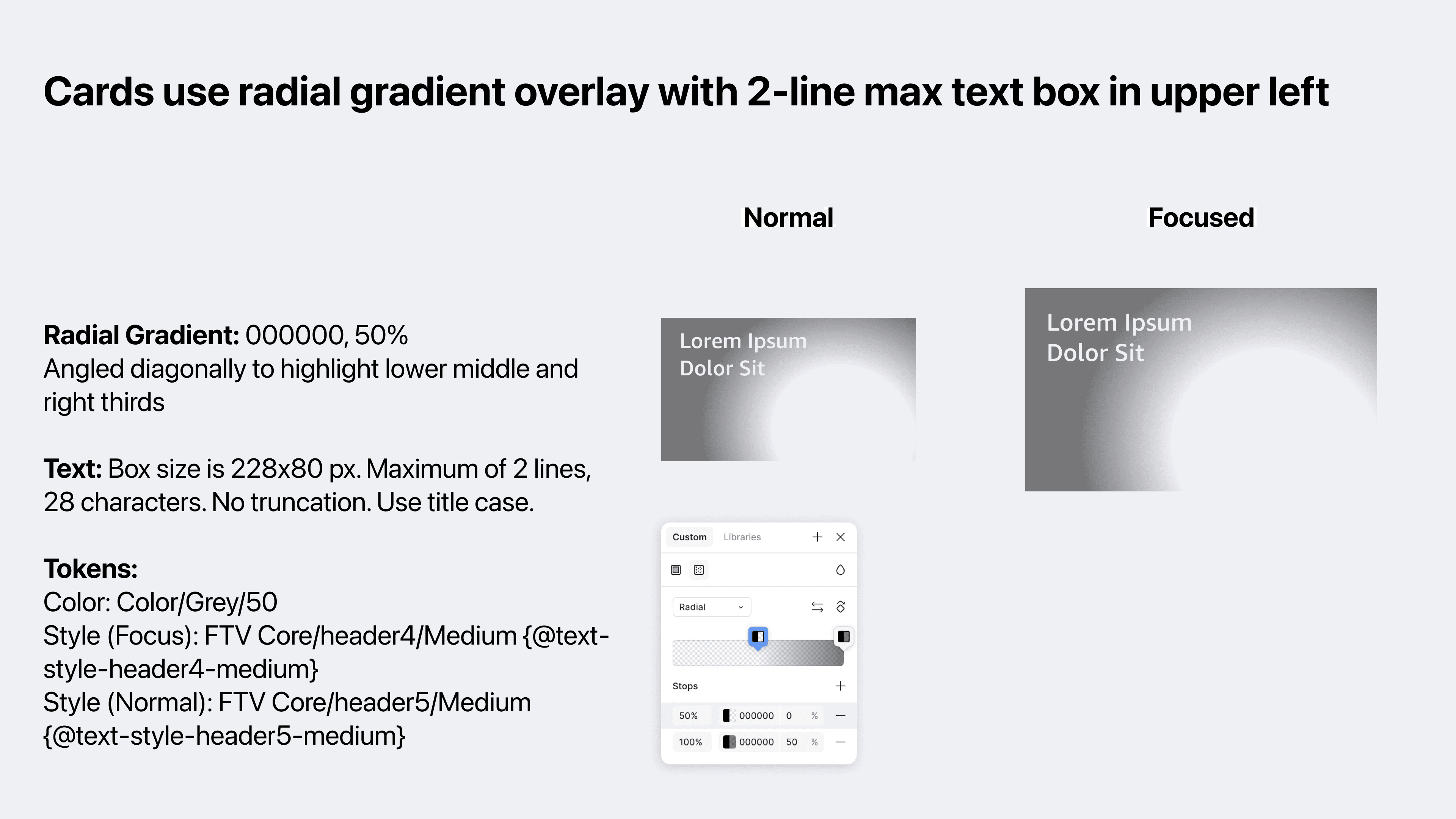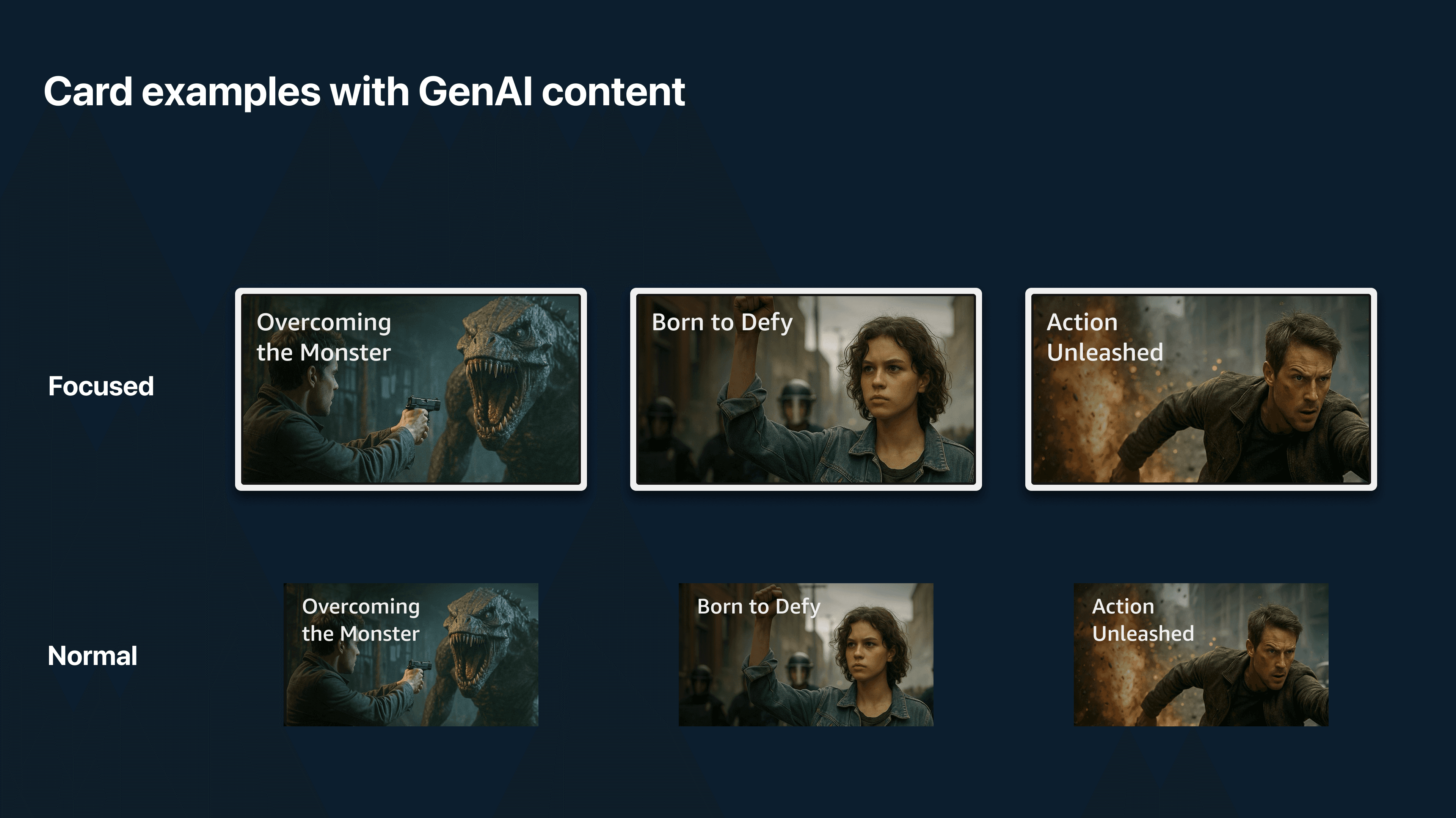 Action: I led the visual design for a new feature that used an LLM to display personalized, AI-generated content categories based on a user's viewing habits. After single-handedly developing eight distinct design concepts and iterating through team critiques, I established a final direction that used a radial gradient overlay on cinematic imagery to ensure text legibility. My guidance for the AI image generation specified a photorealistic style and a "rule of thirds" composition to keep the main subject clear of the text area.