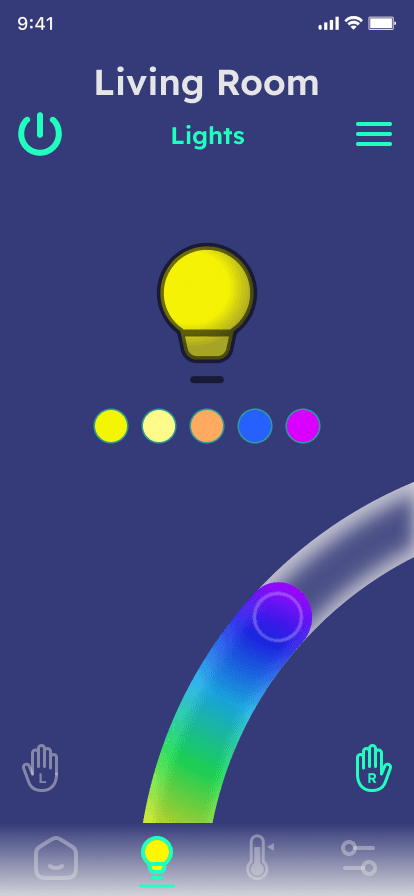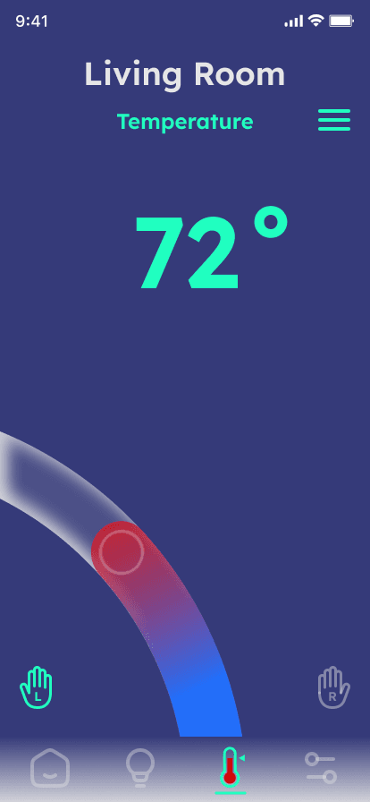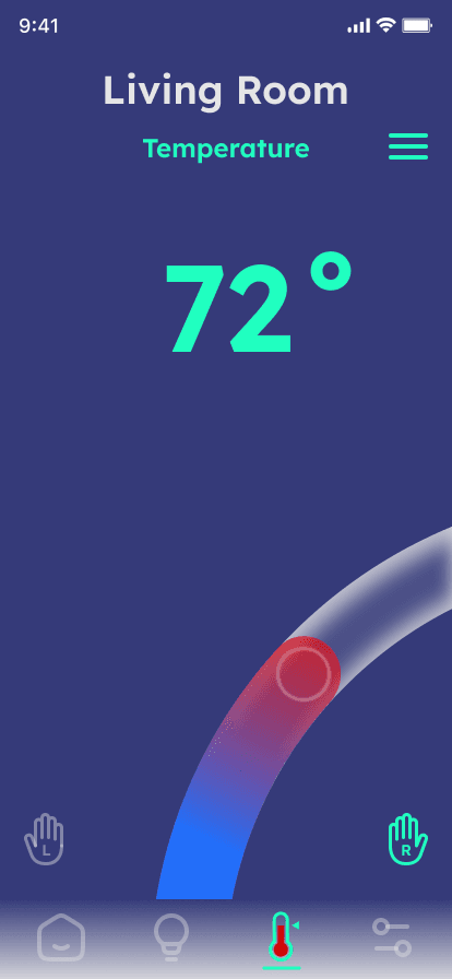 I really enjoyed the arced slider solution I arrived at to control elements such as temperature and warmth of lighting, which made use of natural range of motion for the thumb - of either hand! Left handed users are no longer penalized by handedness-specific control patterns or locations, thanks to the right and left handed switch icons on all thumb slider screens, which flip the slider’s orientation—via an entertaining animation, of course.